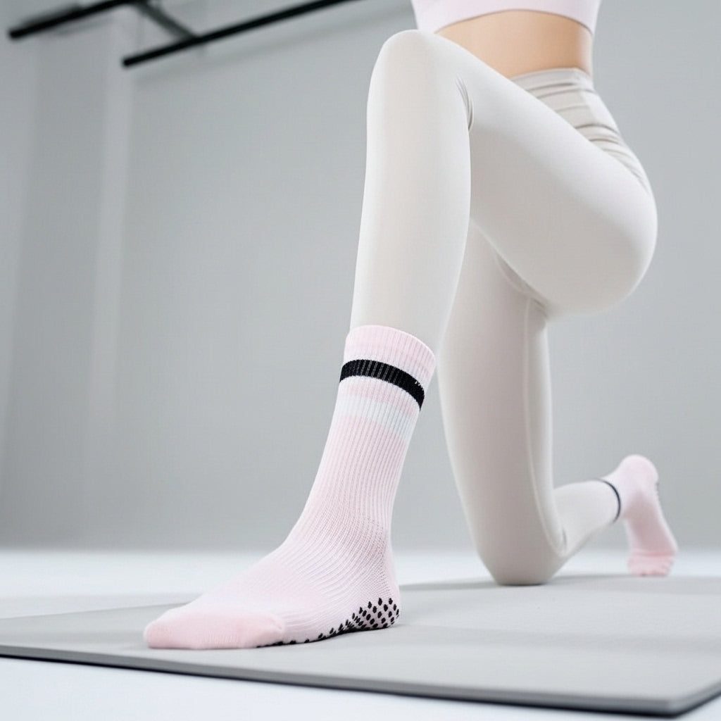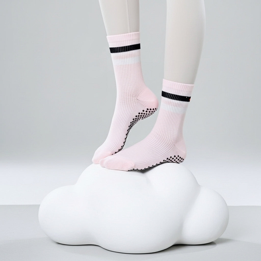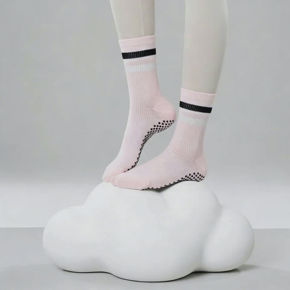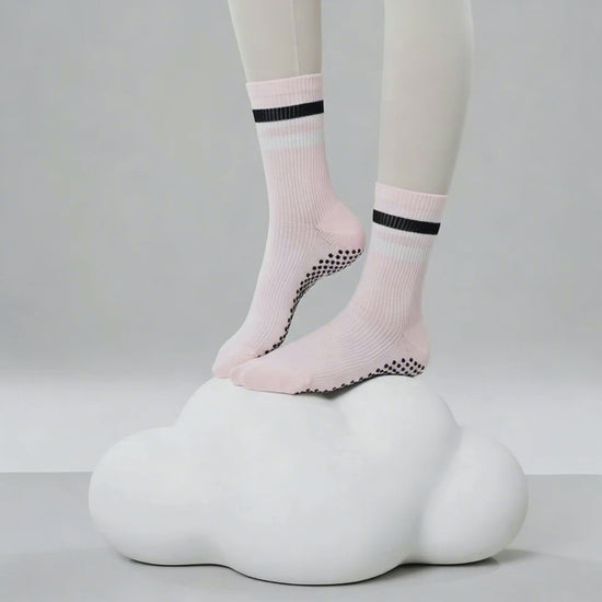 Unfold your grace with Peony. Inspired by the lush, delicate petals of the beloved flower, these soft pink pilates socks are a tribute to feminine strength. The gentle hue is perfectly contrasted by bold, modern stripes, creating a look that is both soft and strong, just like you.