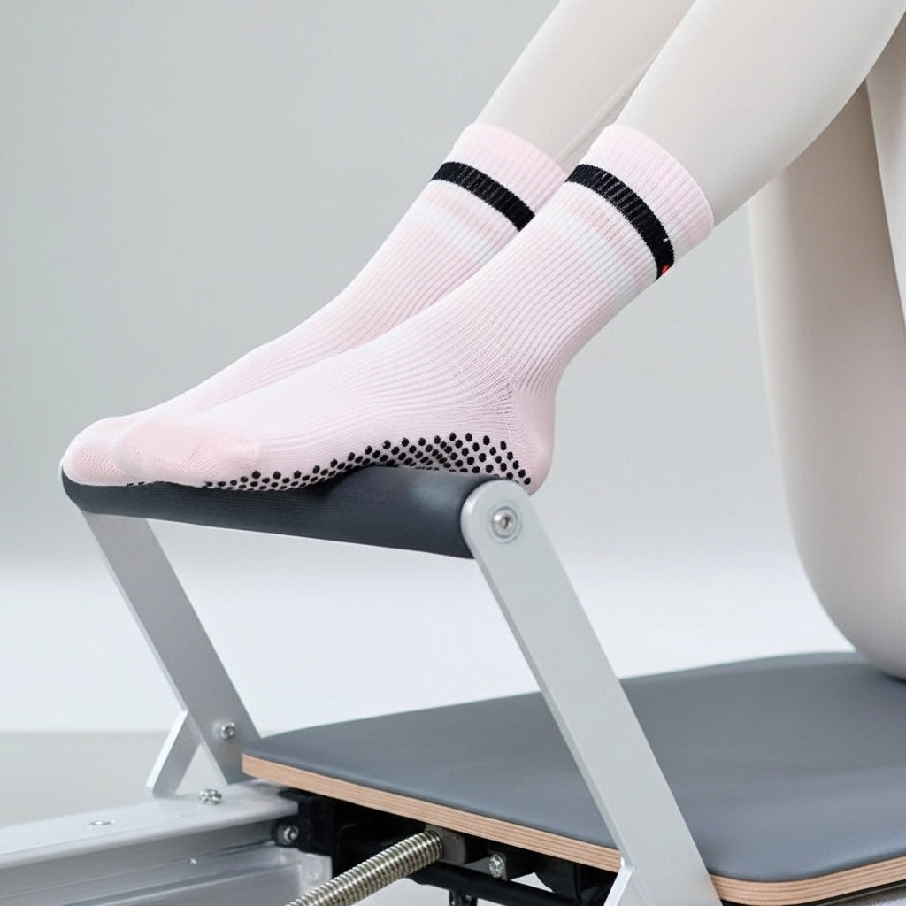 The anatomical fit wraps your foot like a glove. A seamless toe and strategic arch support provide freedom of movement, while the high-density silicone grip guarantees maximum traction on the reformer and mat.