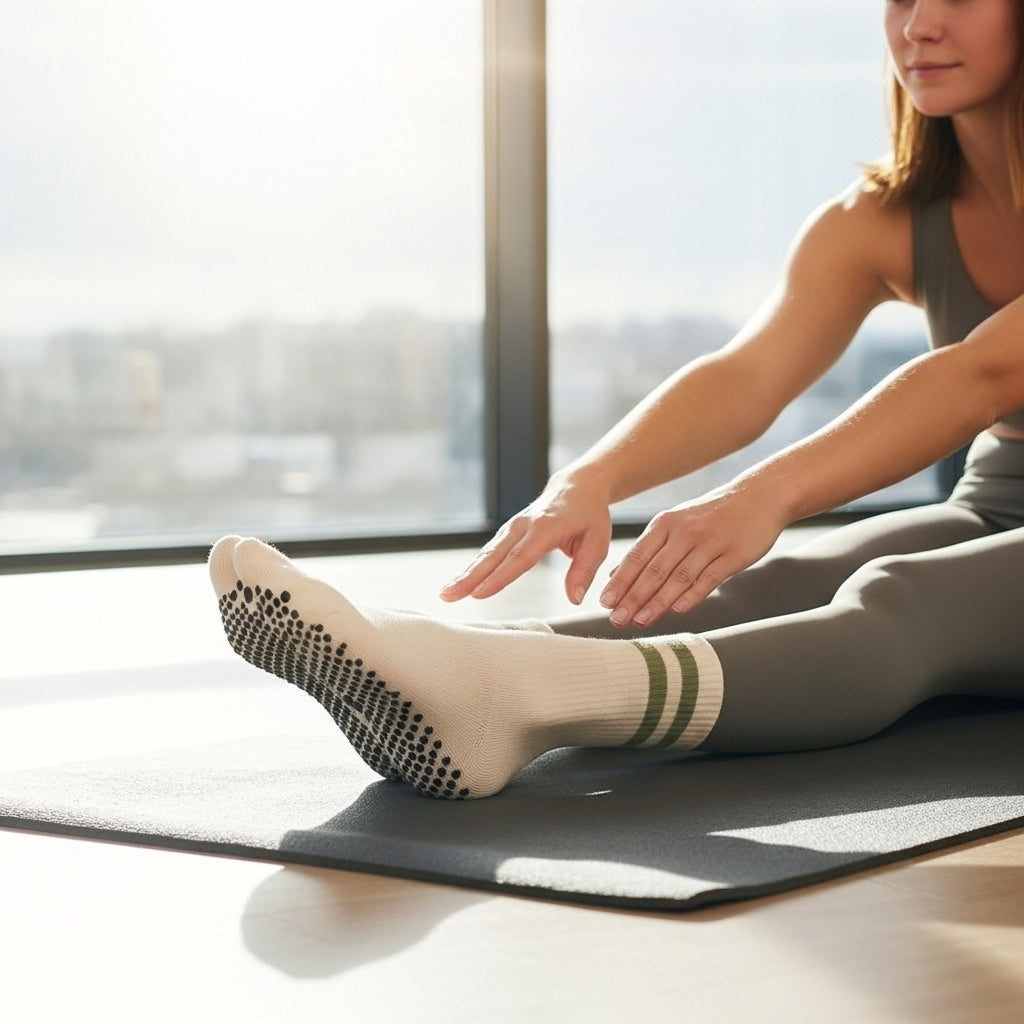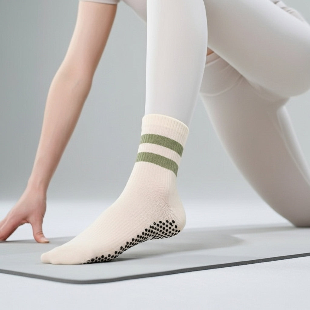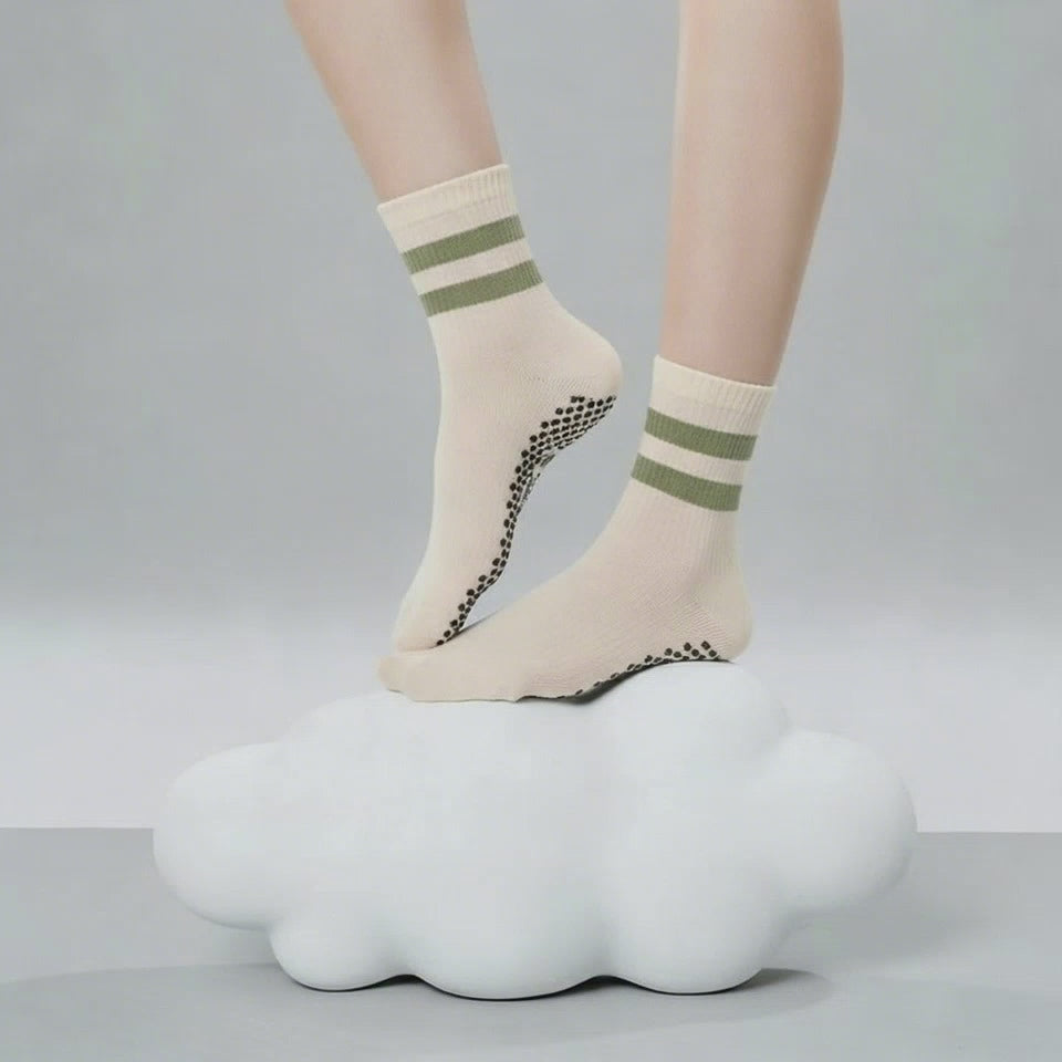 Connect to your foundation with Terra. Named for the earth beneath us, these pilates socks feature a natural cream hue and serene sage green stripes, designed to bring a sense of grounding and stillness to your every movement.