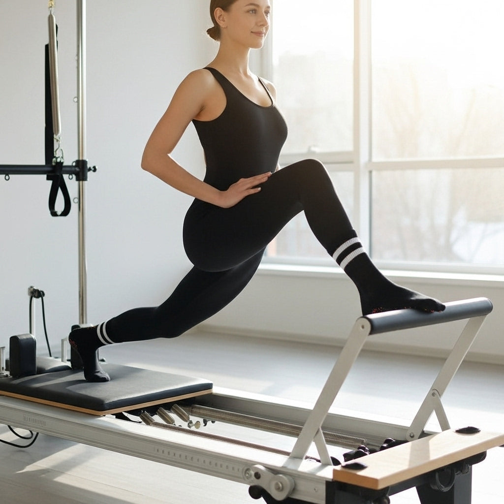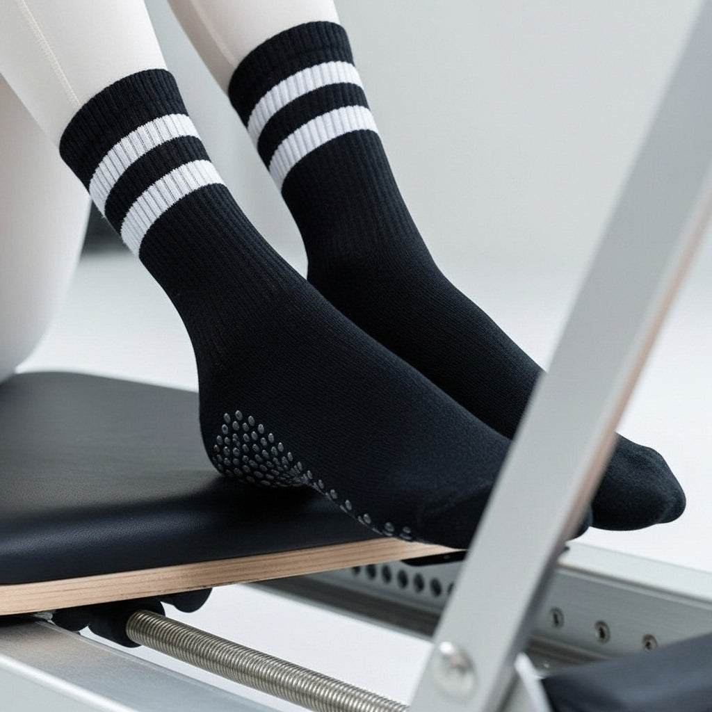 The anatomical fit wraps your foot like a glove. A seamless toe and strategic arch support provide freedom of movement, while the high-density silicone grip guarantees maximum traction on the reformer and mat.